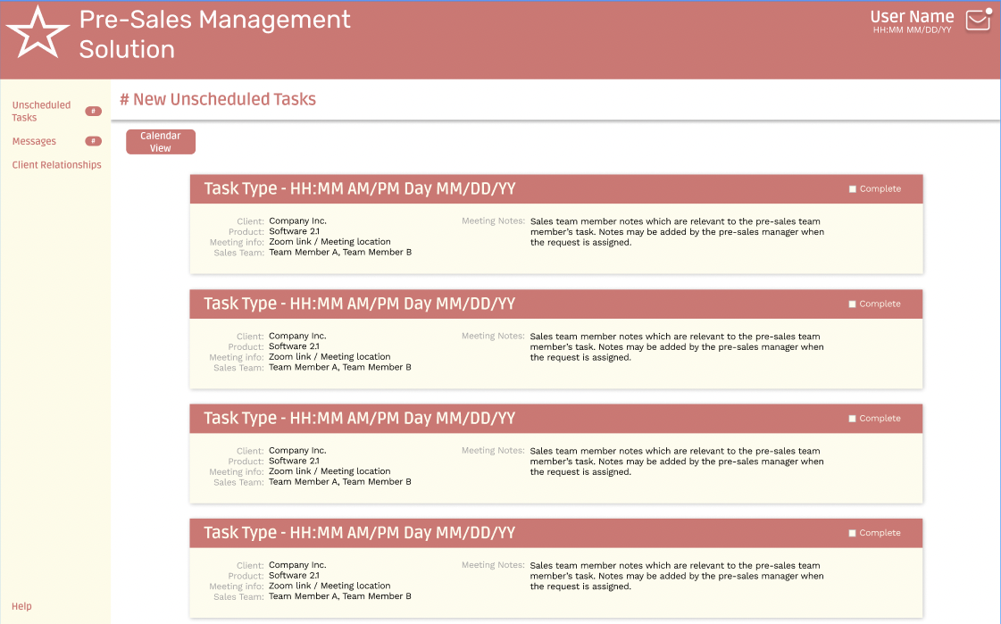 In enterprise software marketing, the pre-sales team is responsible for demonstrating the software which is being marketed. While working on a prospective sale, a sales representative may request the services of the pre-sales team multiple times, and potentially for multiple products throughout the process. There is currently no software solution on the market for the scheduling of these demonstrations which meets the needs of our client.